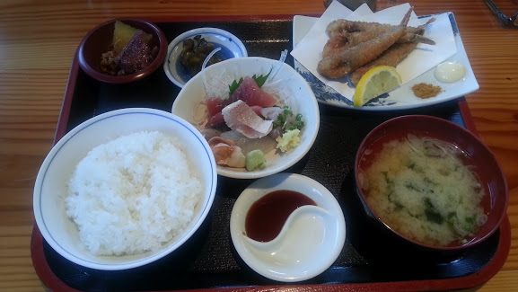 しかし残念な事に日曜とあって生シラス漁の船がでないそうで、断念。変わって、まぐろカツとお奨めの海鮮ちらしをいただいた。暑さ2㎝位の厚切りのまぐろにカラッとした衣は、食べごたえ充分で大満足。魚市場直送のまぐろは、一味違う。